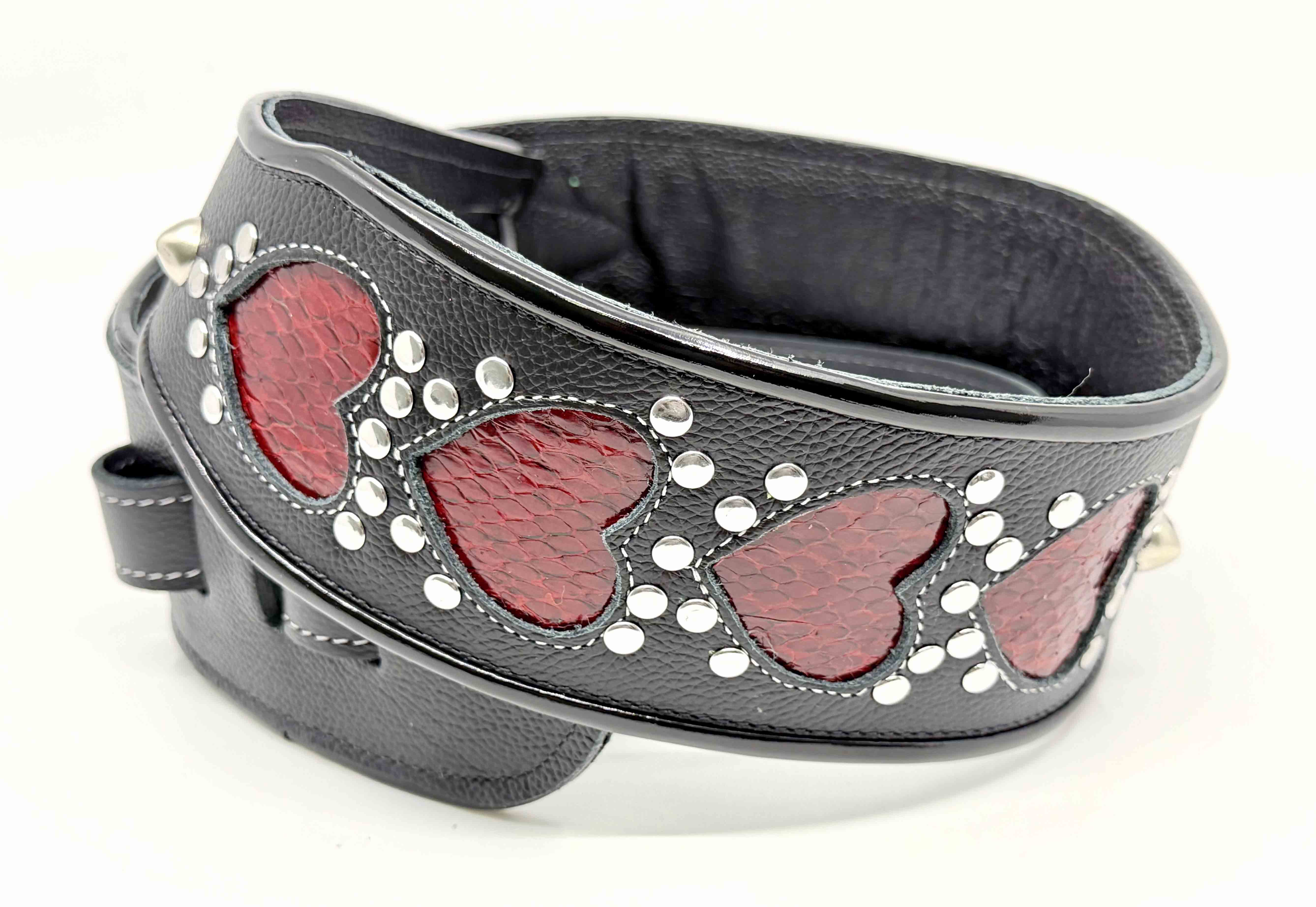 3" Black leather guitar strap, Silver Studs, White stitching, Red Snake hearts, fully adjustable.