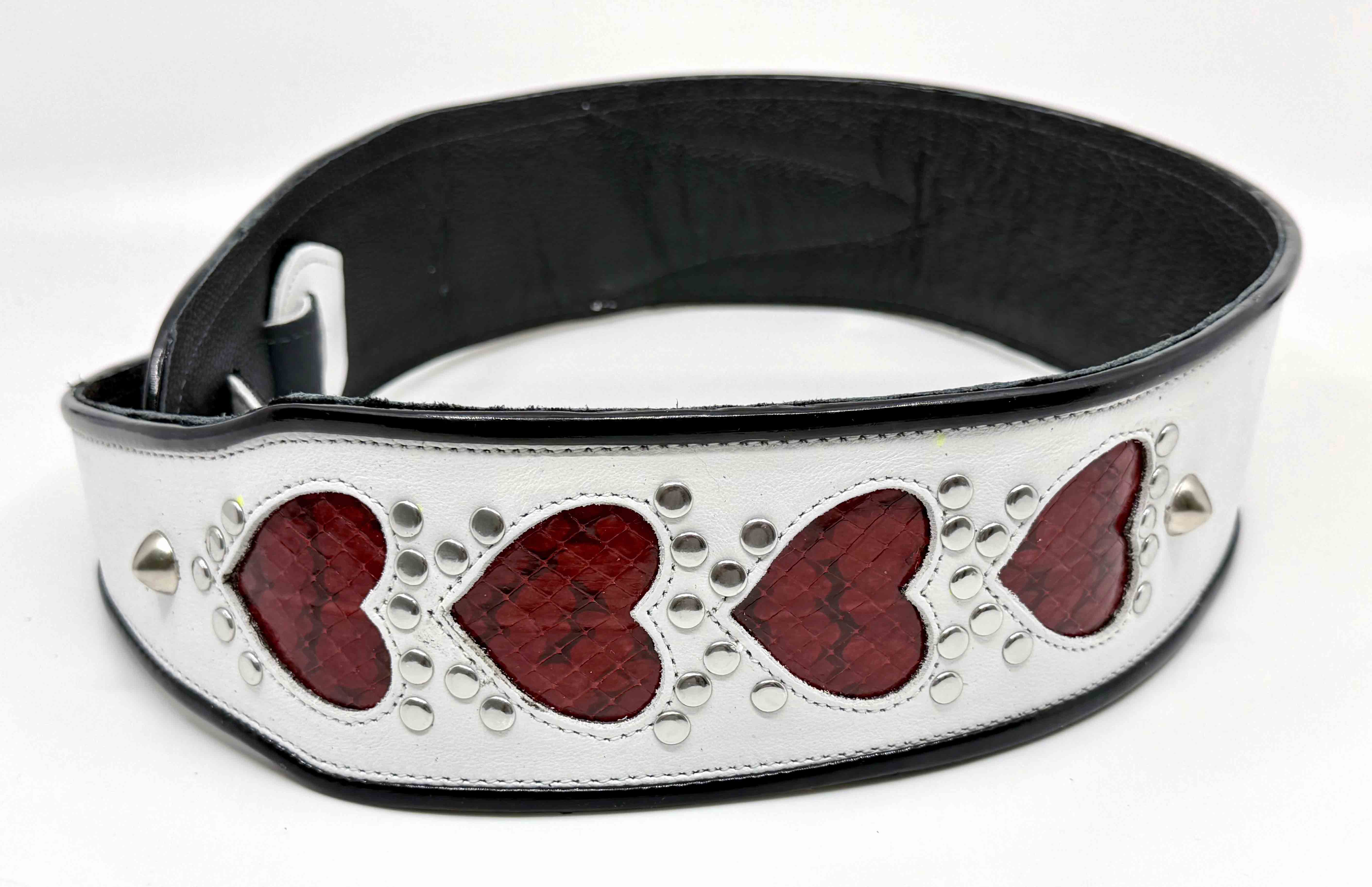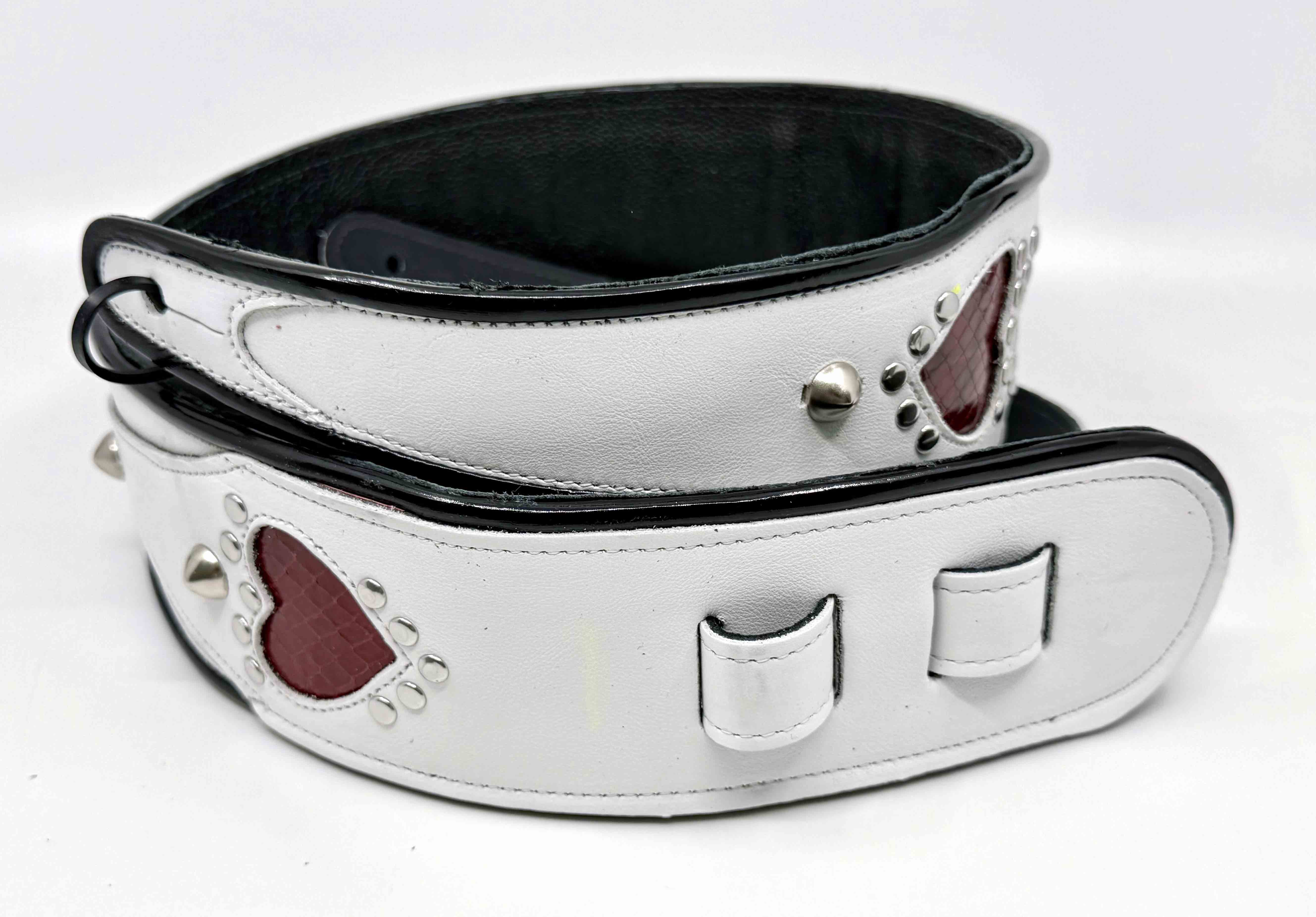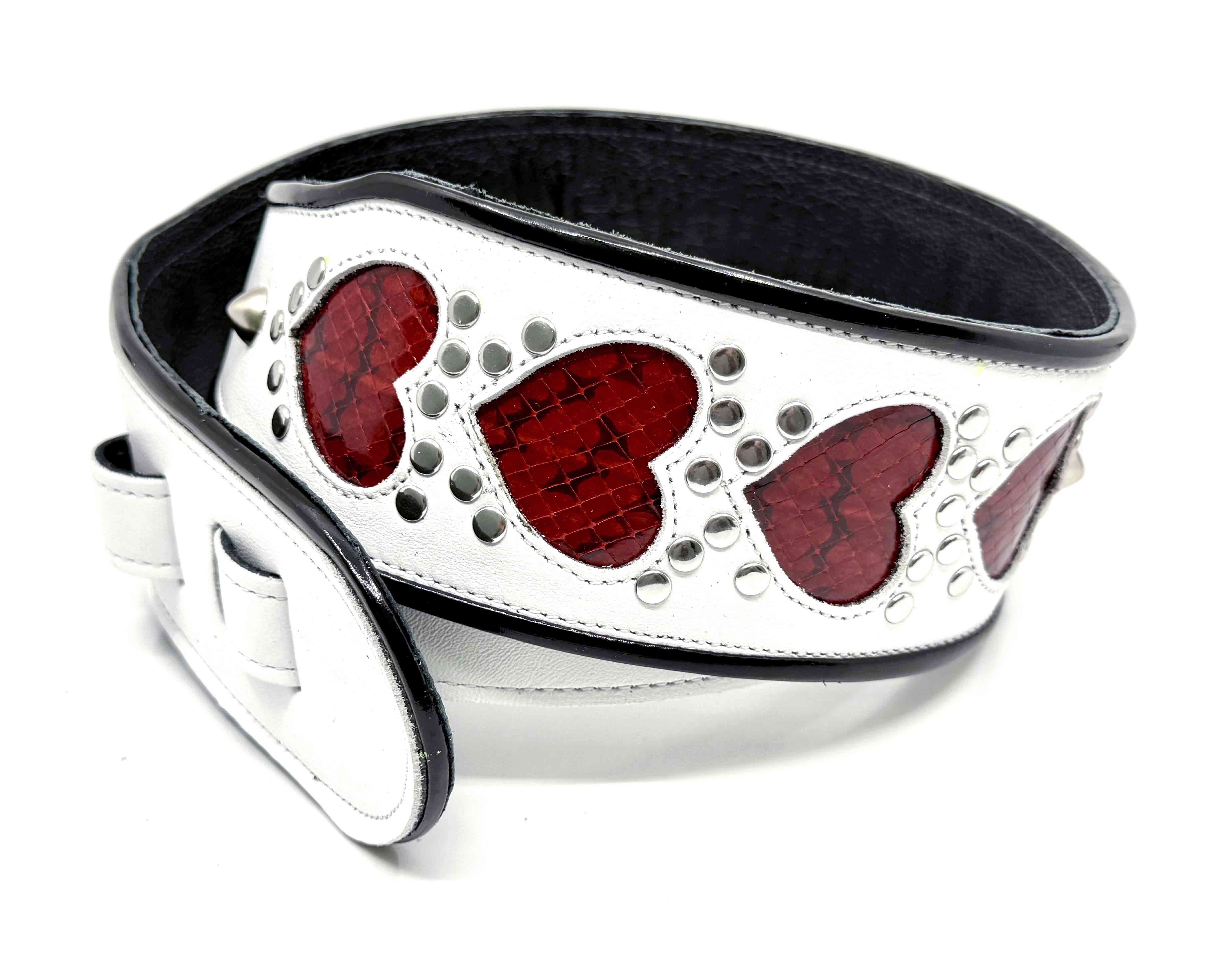 3" White leather guitar strap, Black edging, Silver Studs, White stitching, Red Snake hearts, fully adjustable.