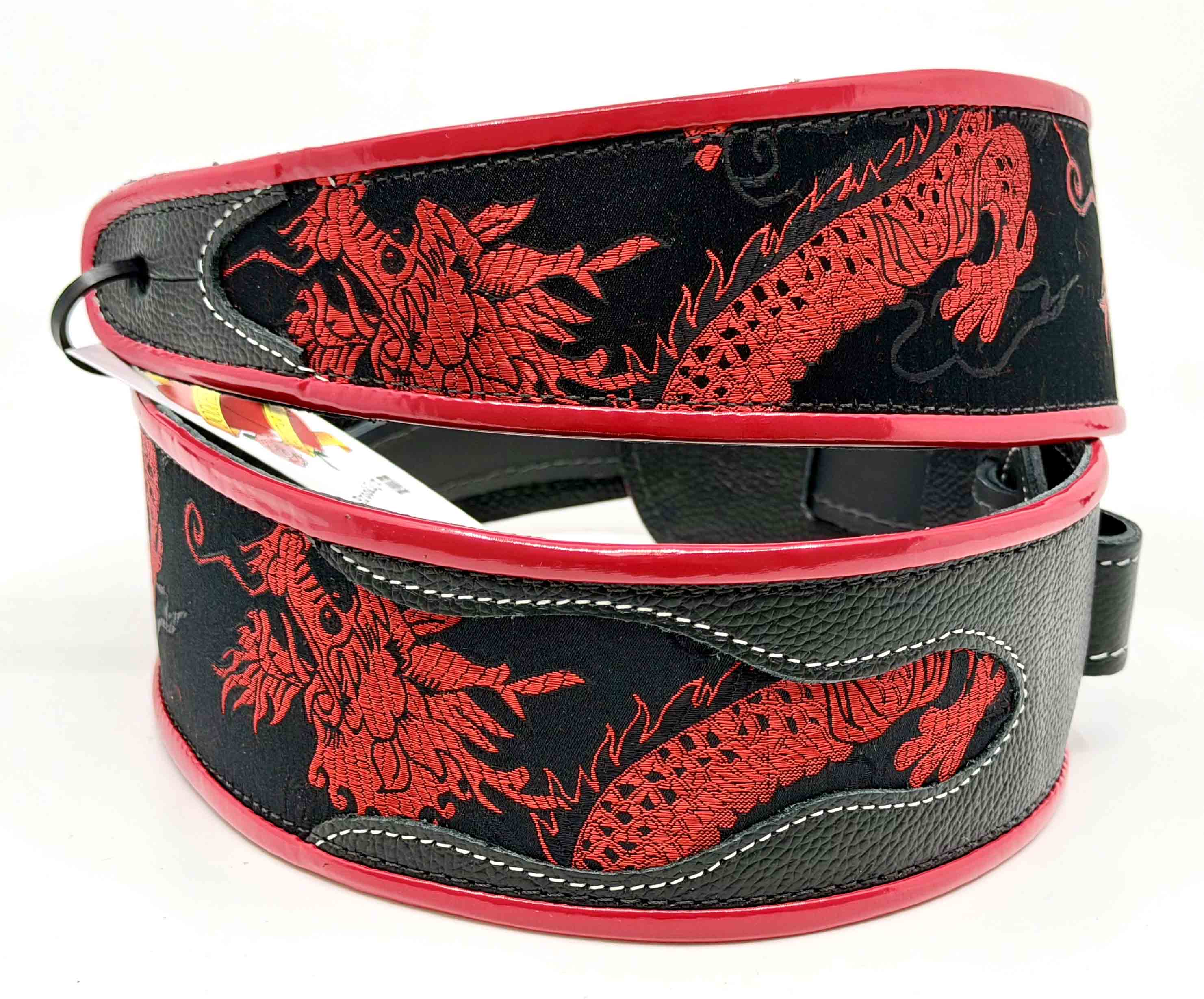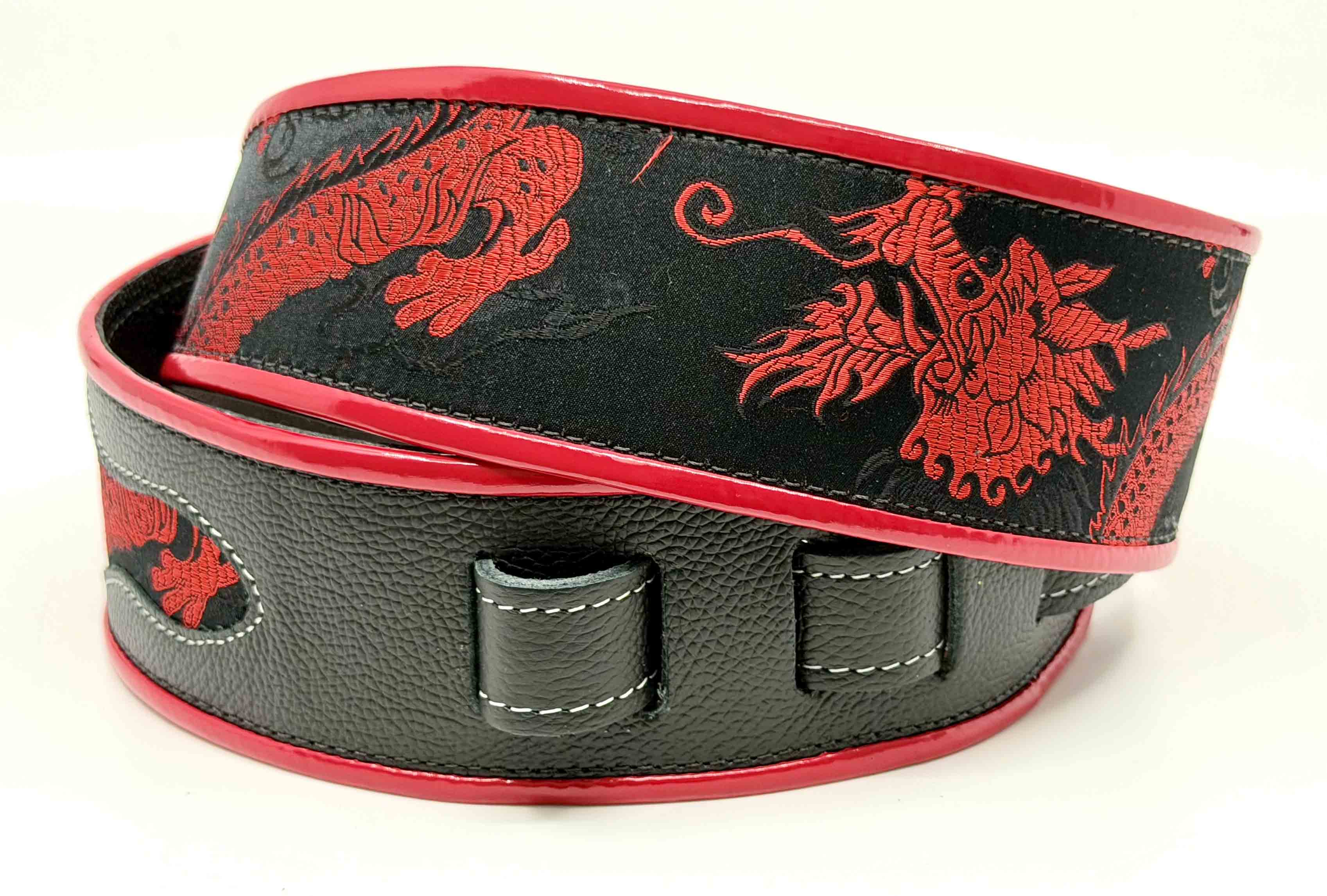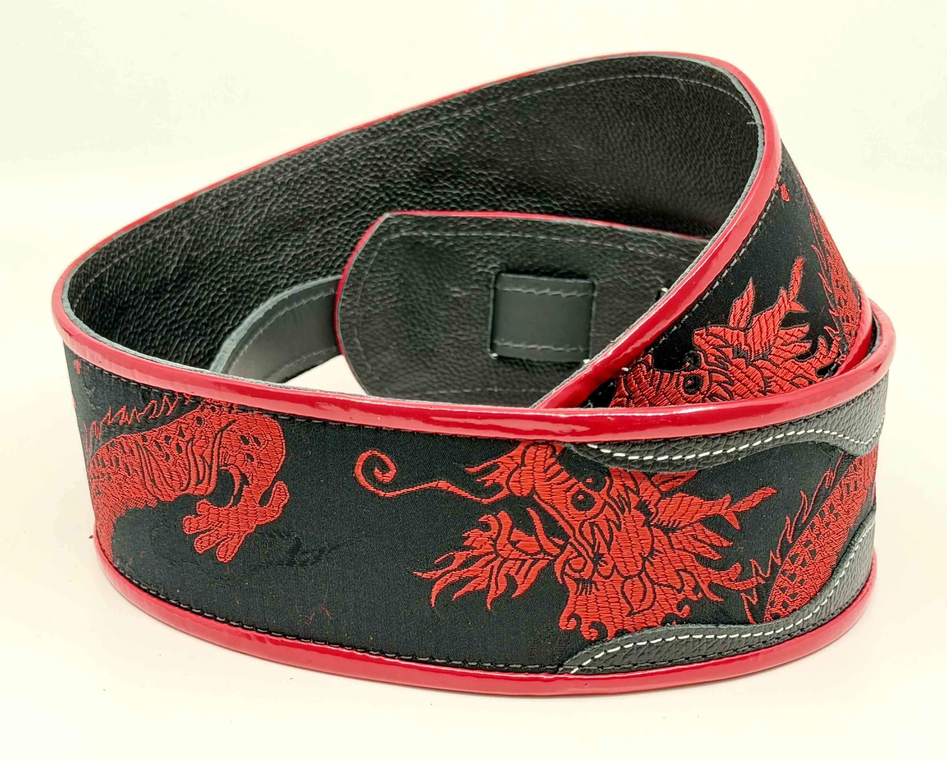 2.5" Brocade Silk Dragon strap with binding and leather lining in Red and Black, and Red edging.