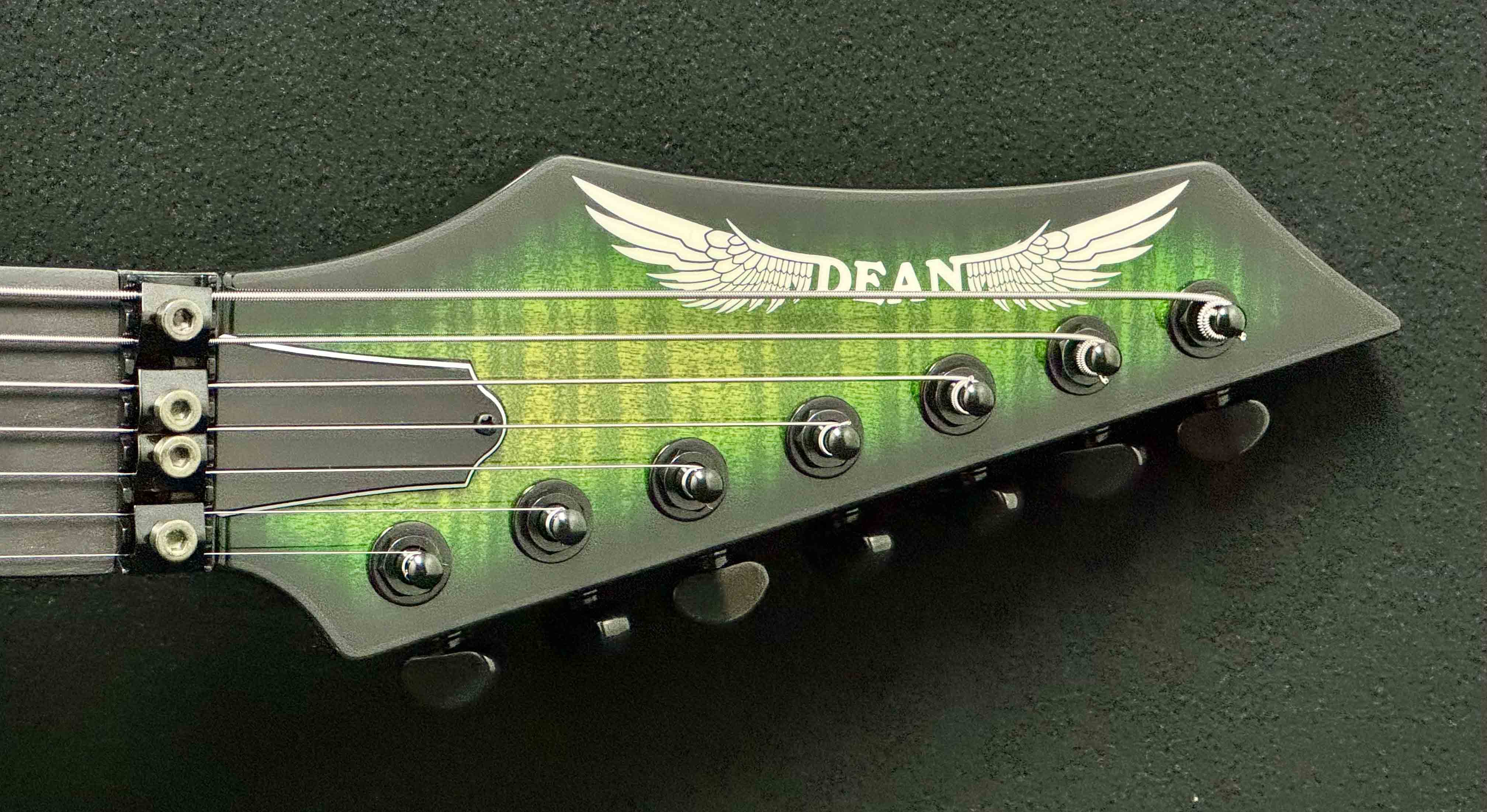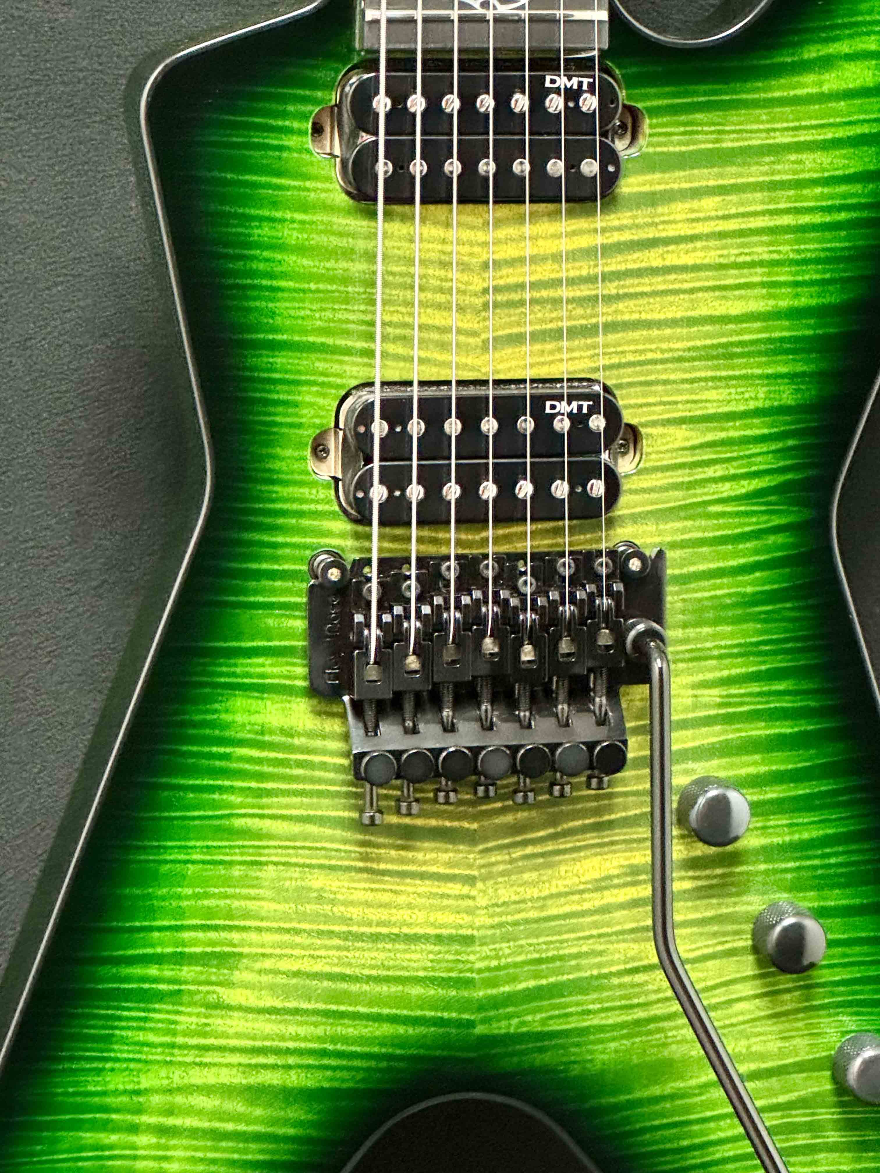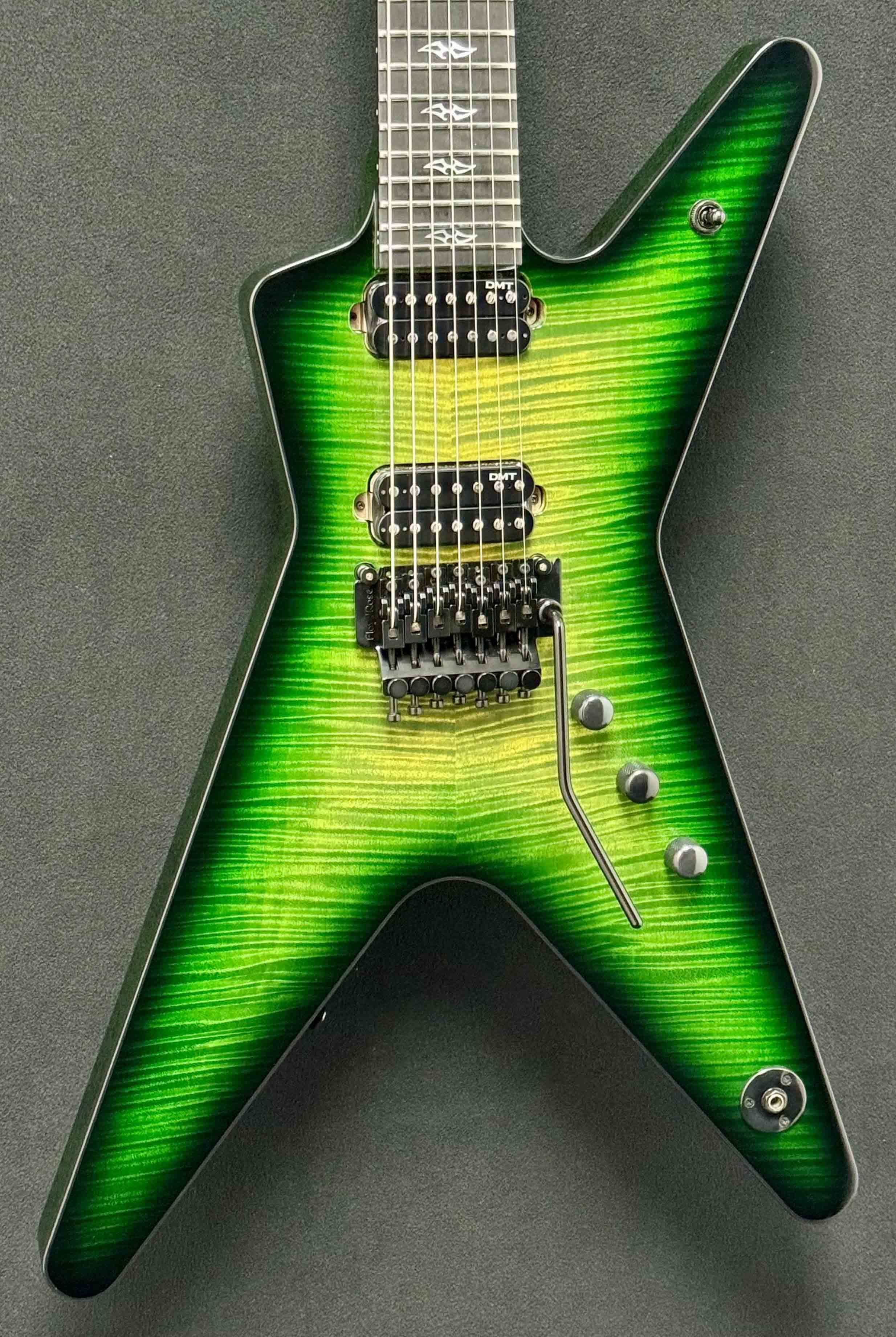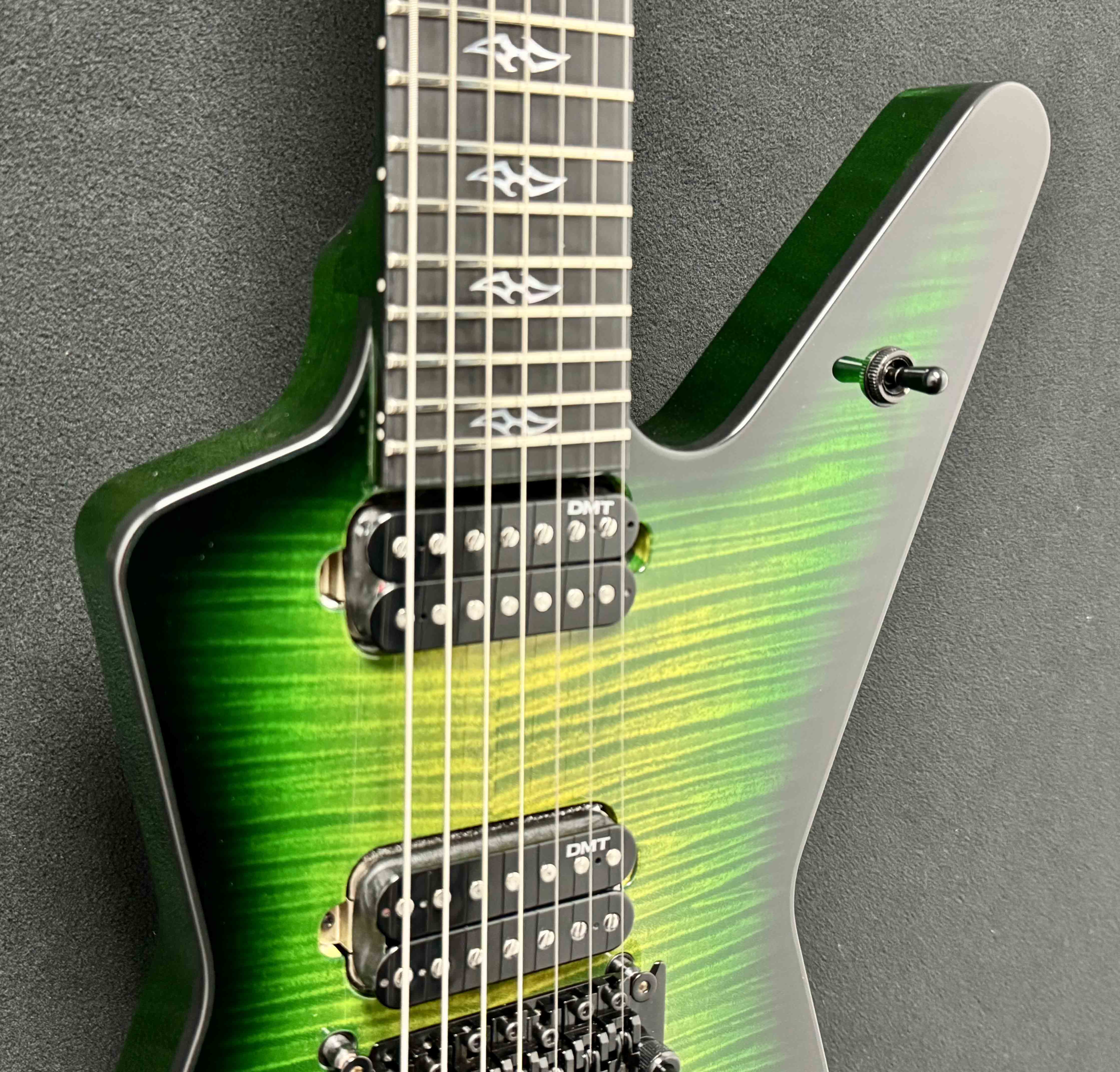 Dean starts with a 7 string platform in a stunning Emerald Burst Flame Maple finish with Trans Green back and sides on a Mahogany body and neck. 25.5" scale, Ebony fret board, Slim C neck profile, 12" fingerboard radius, 1 7/8" Floyd Rose nut and Bridge, 24 jumbo nickel frets, Ultra Diamond inlays, Reverse 7 Inline Head Stock with segmented wings, DMT Nostalgia and Baker Act t double black uncovered pickups, Grover tuners, and .010-.046 "E" Standard strings.
