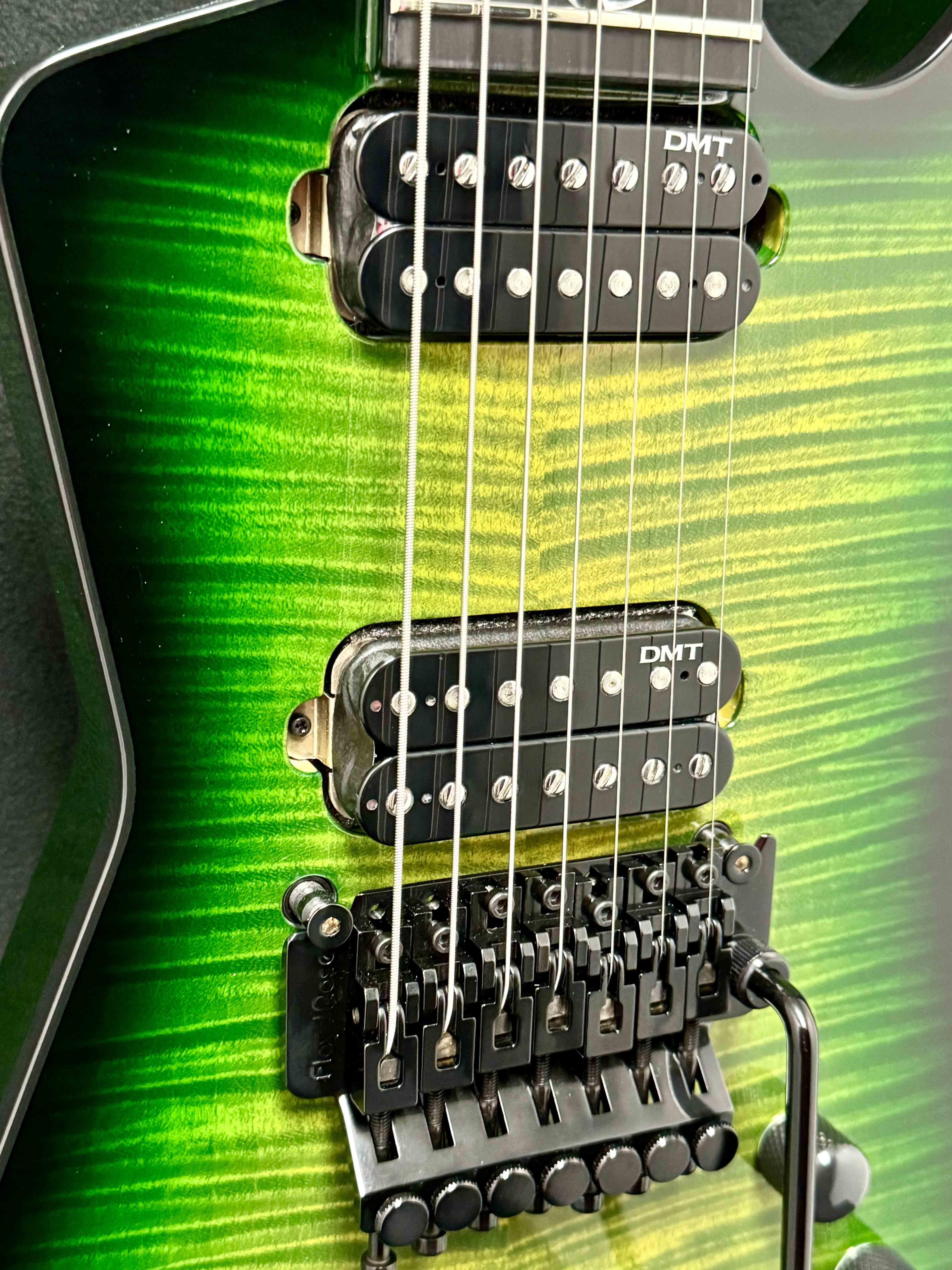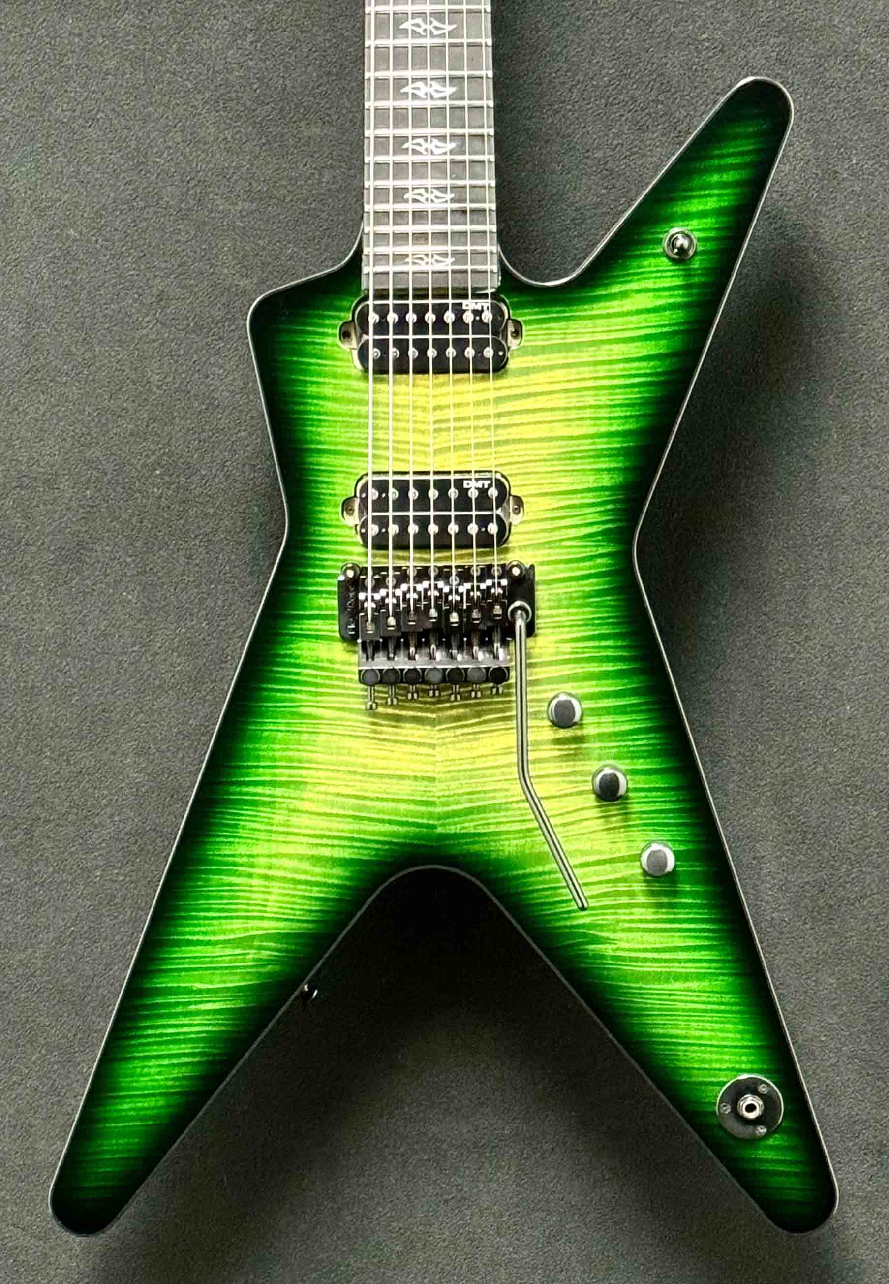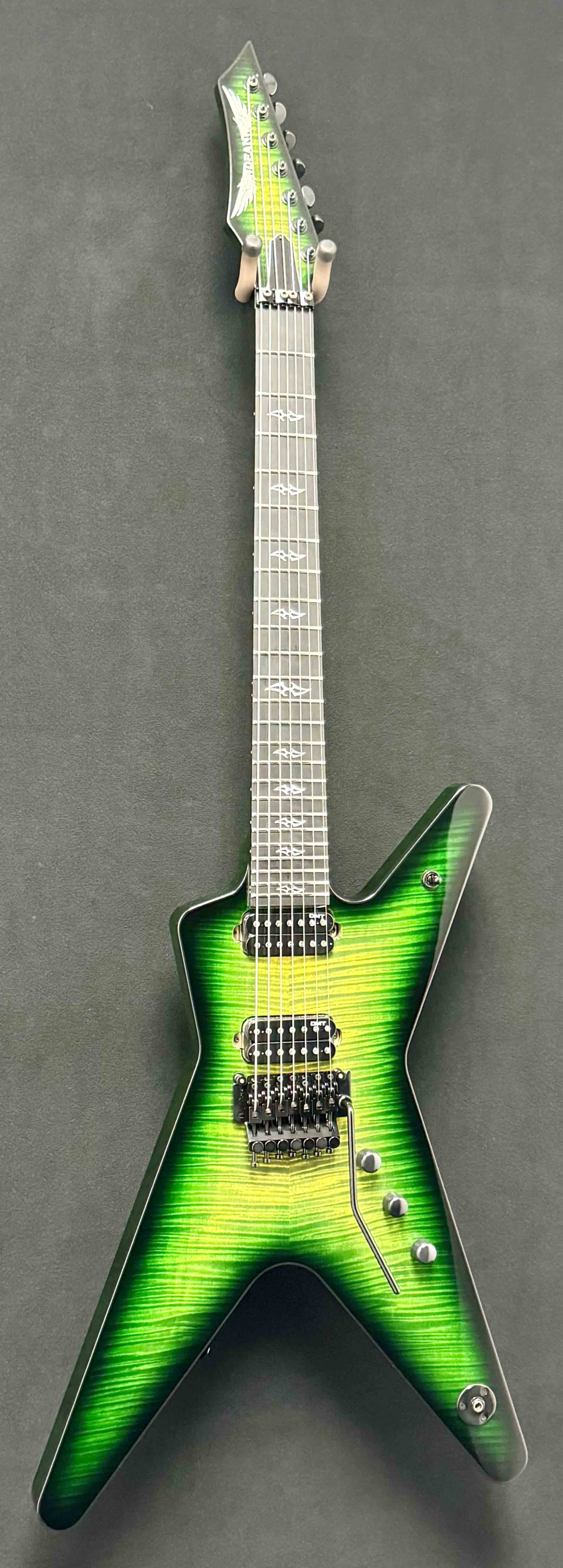 Dean starts with a 7 string platform in a stunning Emerald Burst Flame Maple finish with Trans Green back and sides on a Mahogany body and neck. 25.5" scale, Ebony fret board, Slim C neck profile, 12" fingerboard radius, 1 7/8" Floyd Rose nut and Bridge, 24 jumbo nickel frets, Ultra Diamond inlays, Reverse 7 Inline Head Stock with segmented wings, DMT Nostalgia and Baker Act t double black uncovered pickups, Grover tuners, and .010-.046 "E" Standard strings.