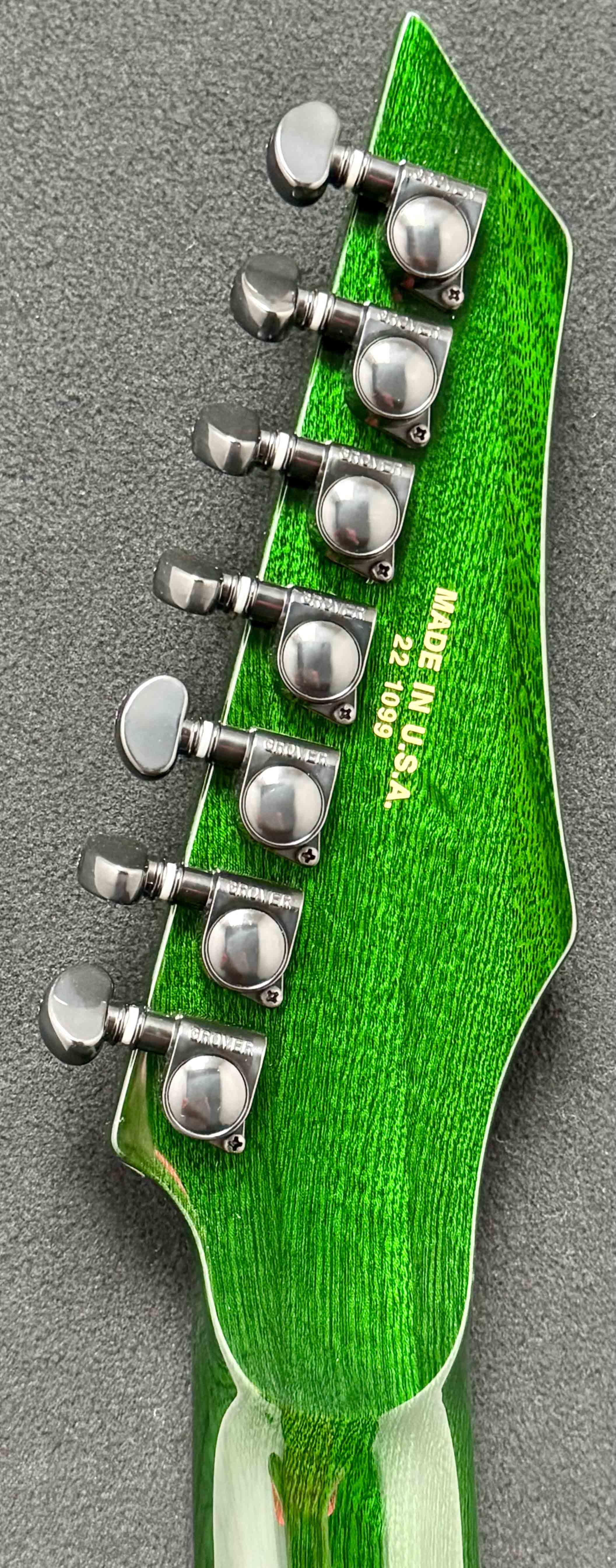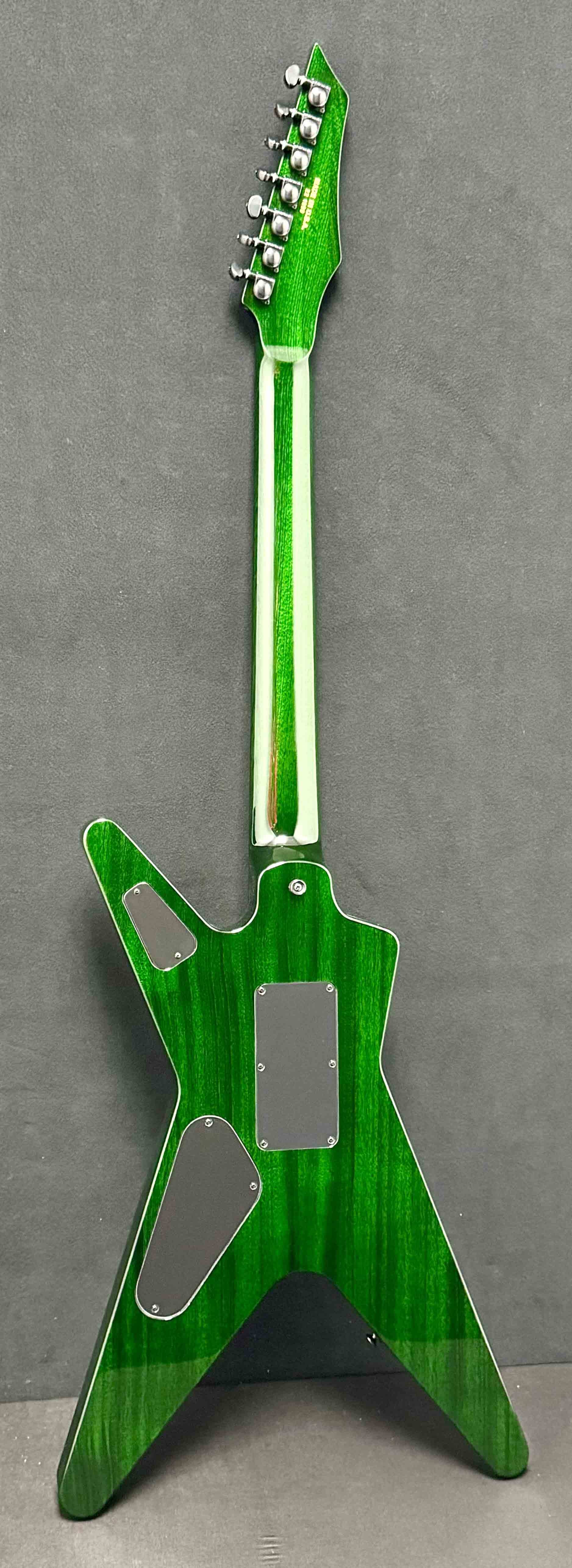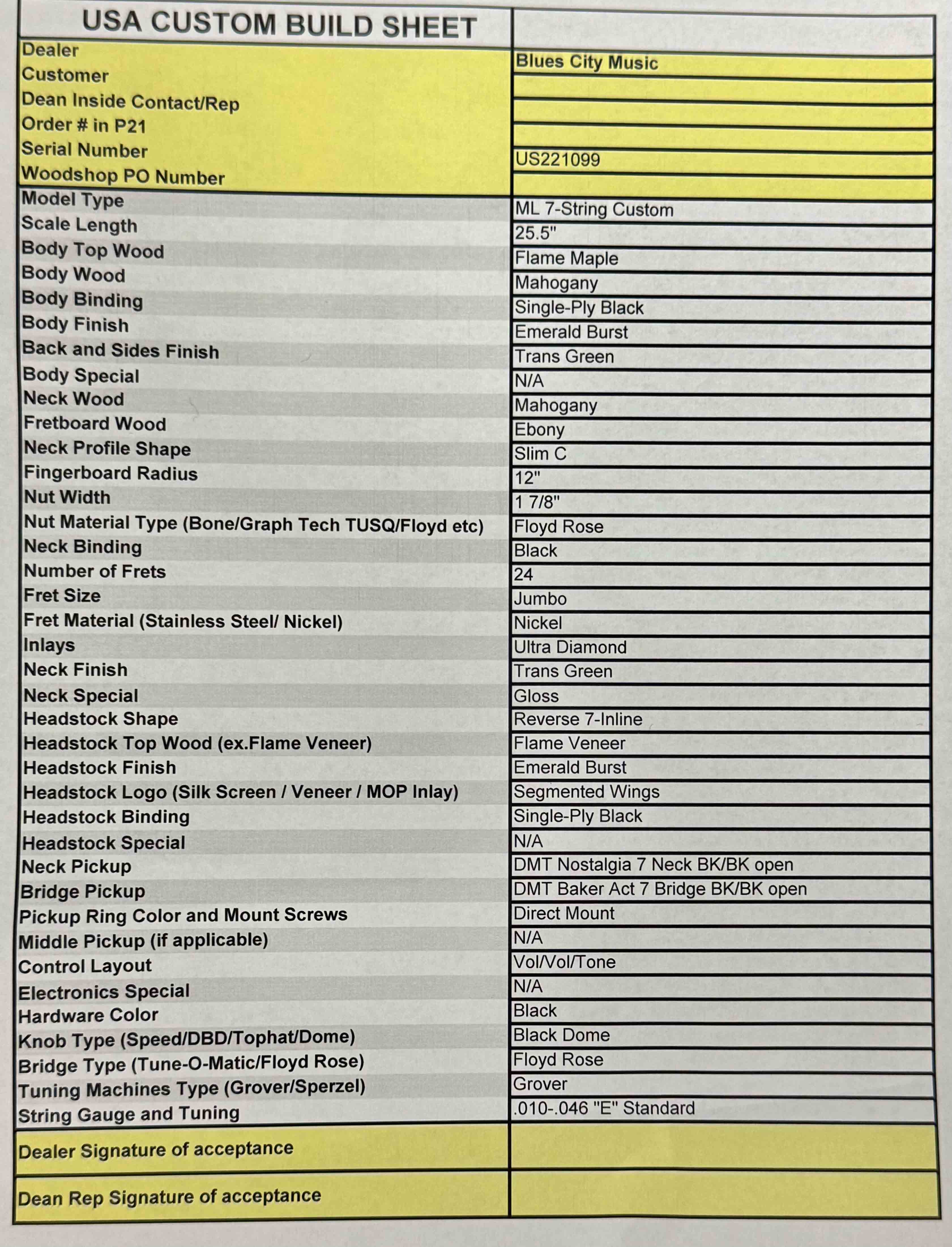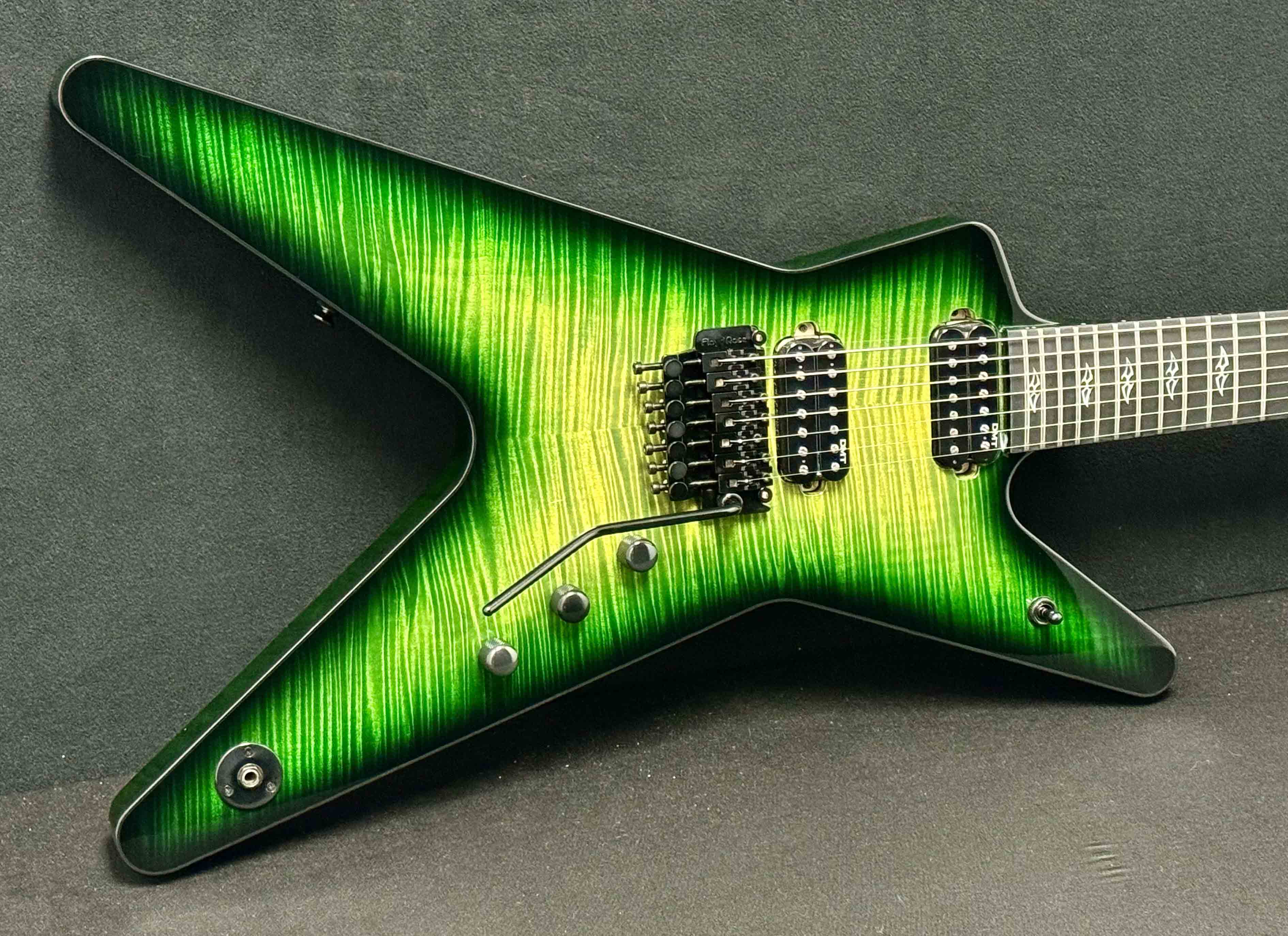 Dean starts with a 7 string platform in a stunning Emerald Burst Flame Maple finish with Trans Green back and sides on a Mahogany body and neck. 25.5" scale, Ebony fret board, Slim C neck profile, 12" fingerboard radius, 1 7/8" Floyd Rose nut and Bridge, 24 jumbo nickel frets, Ultra Diamond inlays, Reverse 7 Inline Head Stock with segmented wings, DMT Nostalgia and Baker Act t double black uncovered pickups, Grover tuners, and .010-.046 "E" Standard strings.