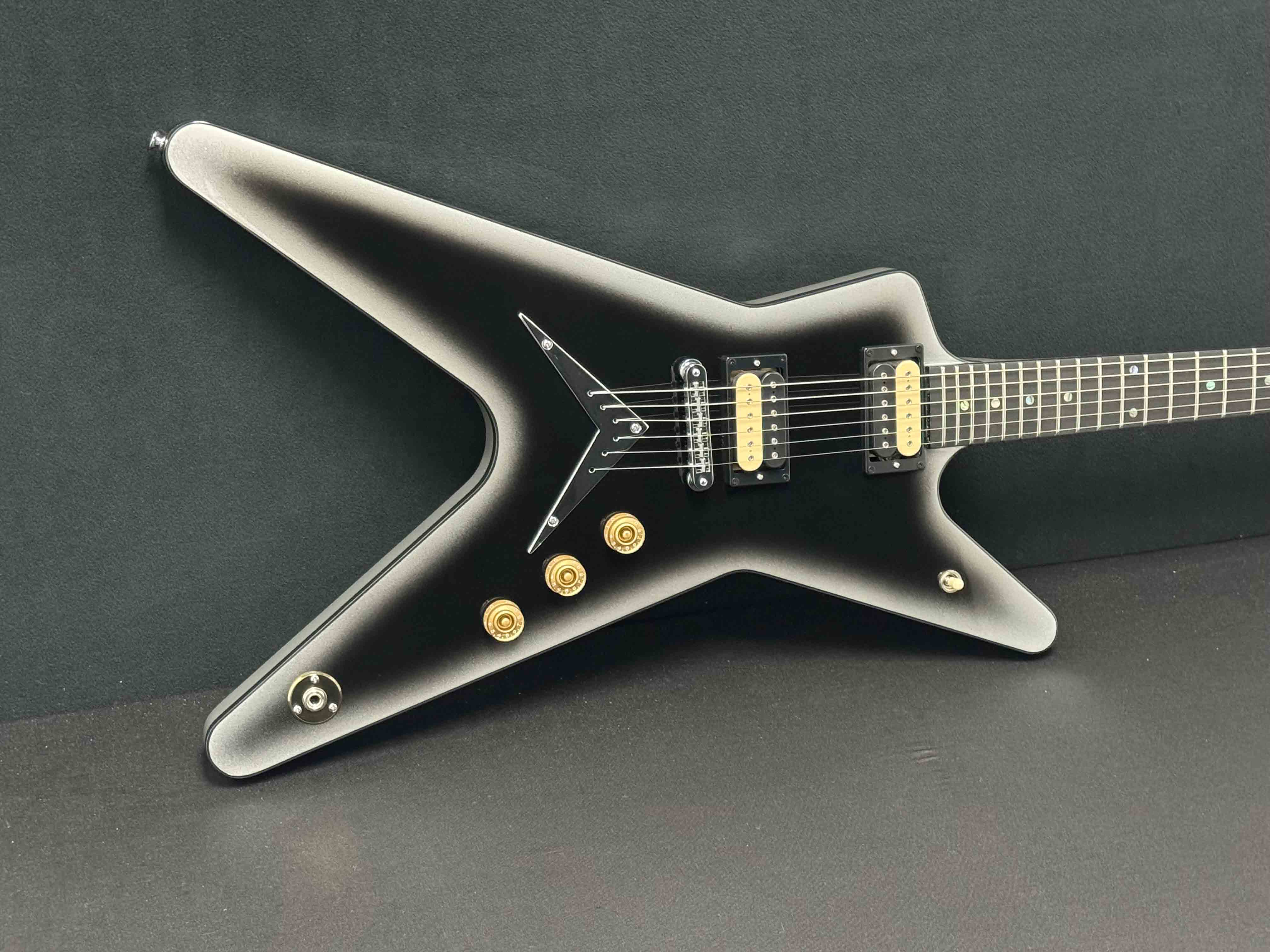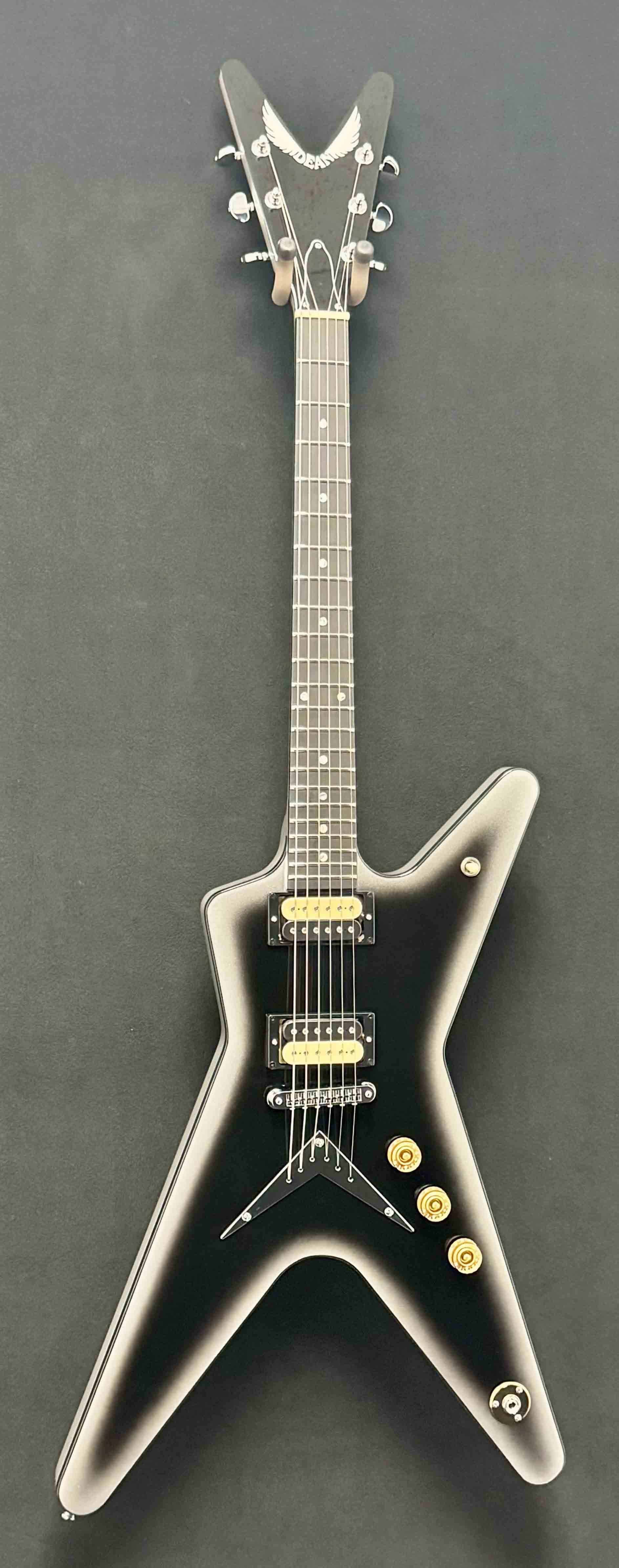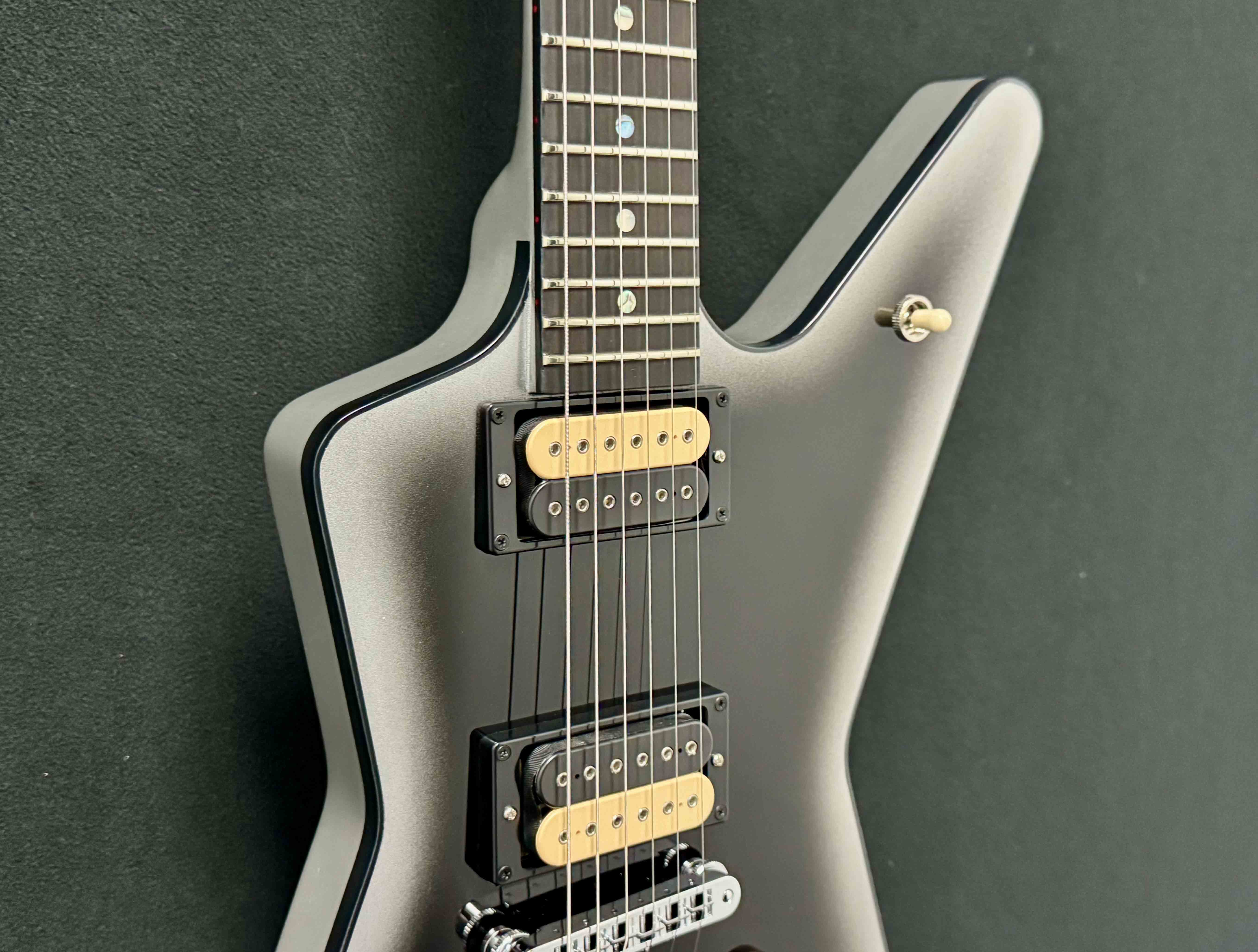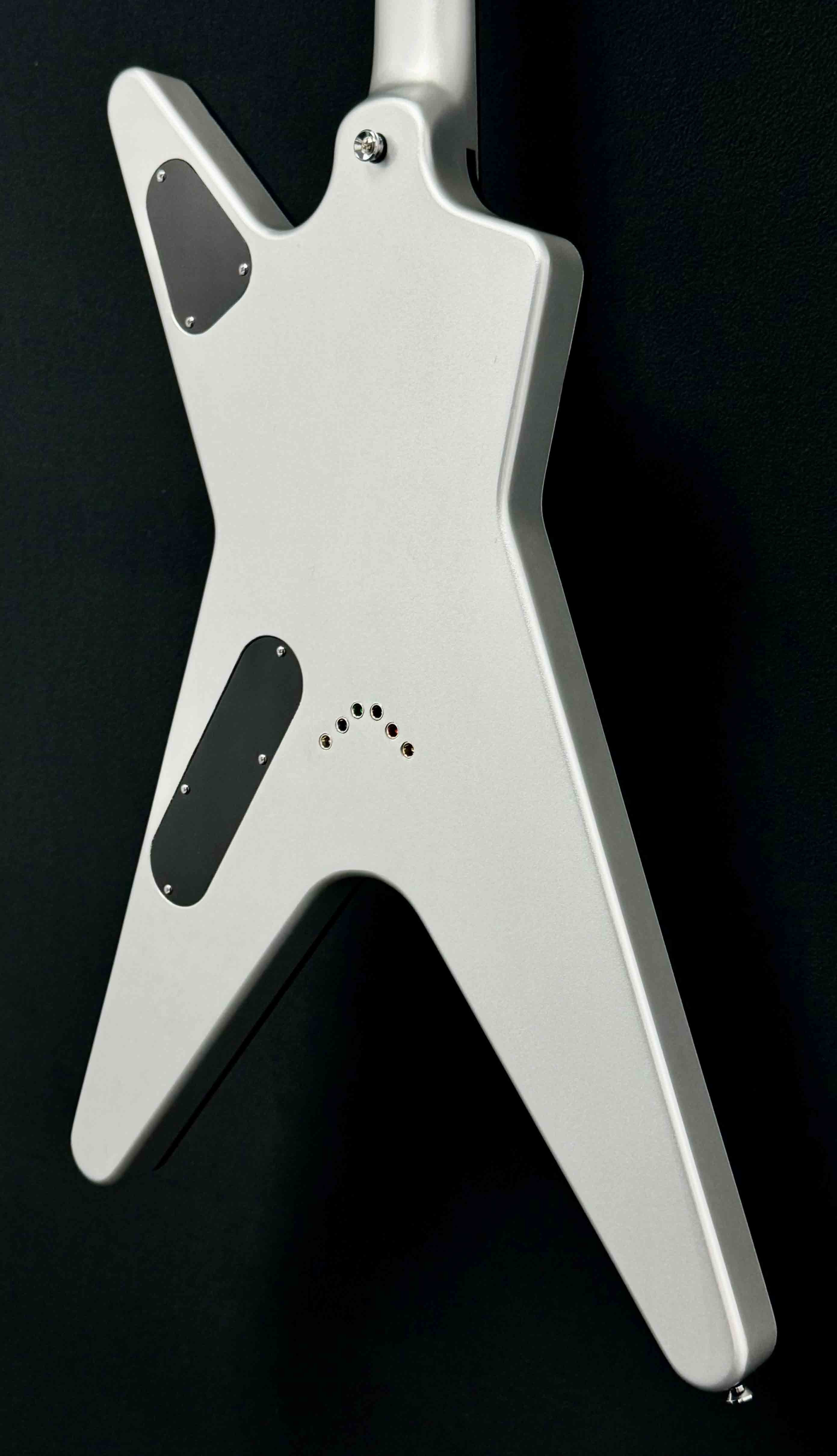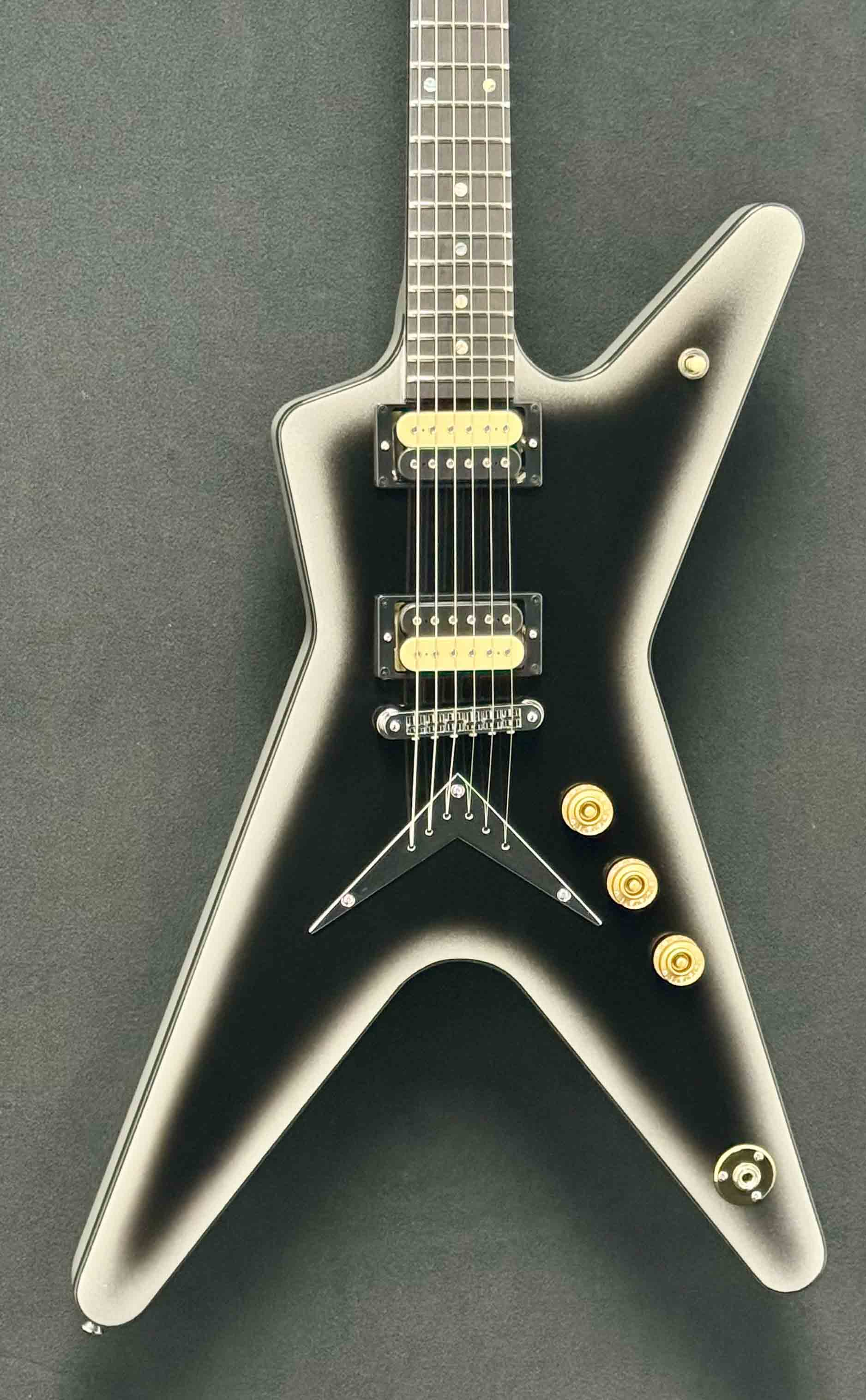 Dean USA has outdone themselves once again. Keeping with Dean tradition and rich history we bring you the “patents pending” series. This flagship ML is in every way exact to its forefather even down to the patents pending stamp on back of the oversized head stock. Now available with a maple top and unique vintage reverse silverburst finish just like you are back in 1977. DiMarzio Super Distortion Pickups, and red side dots on a thinner C shaped neck complete this homage to our proud and rich history of Dean ML! Deluxe Hardshell Case Included.