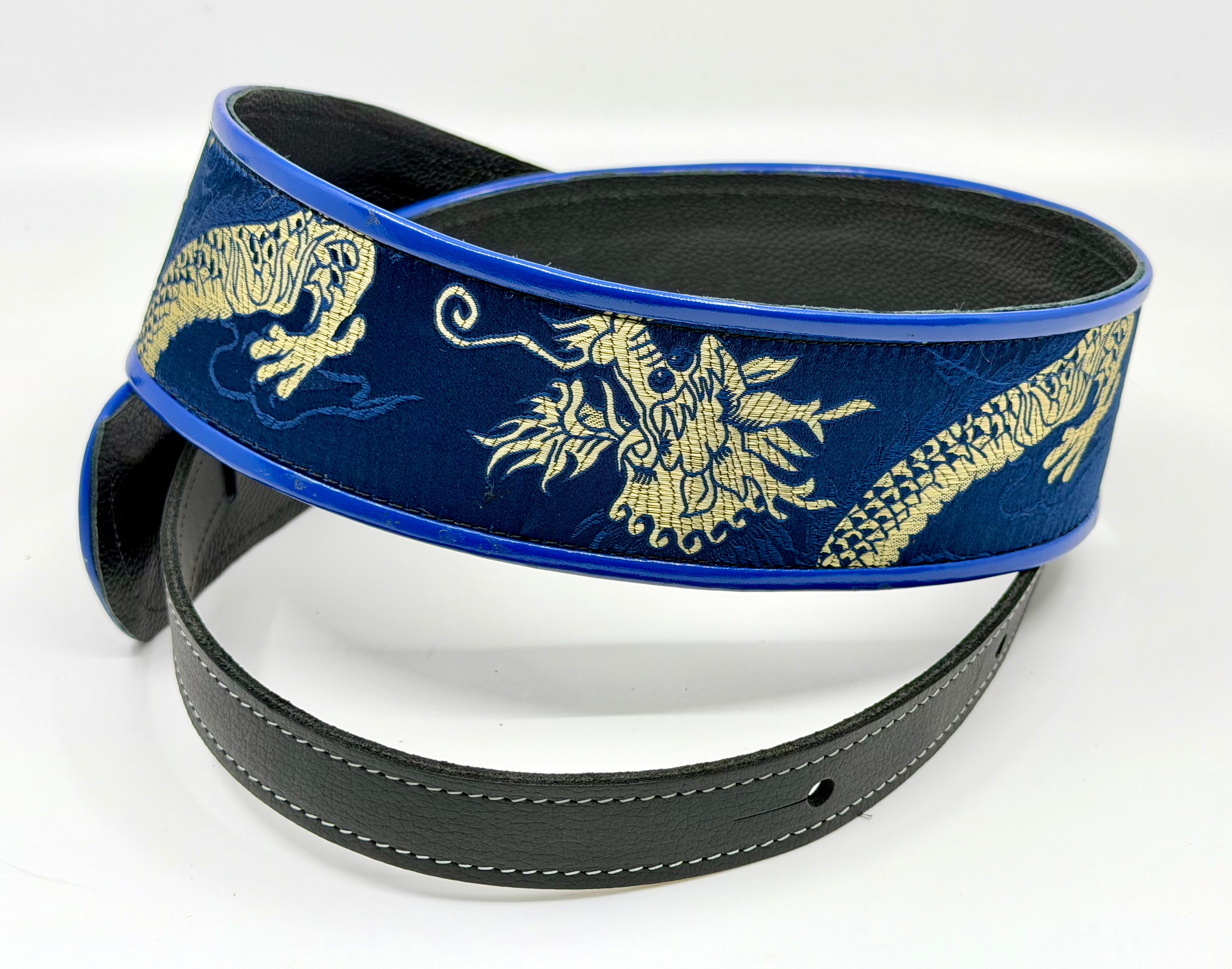 2.5" Brocade Silk Dragon strap with binding and leather lining in Blue and Silver.